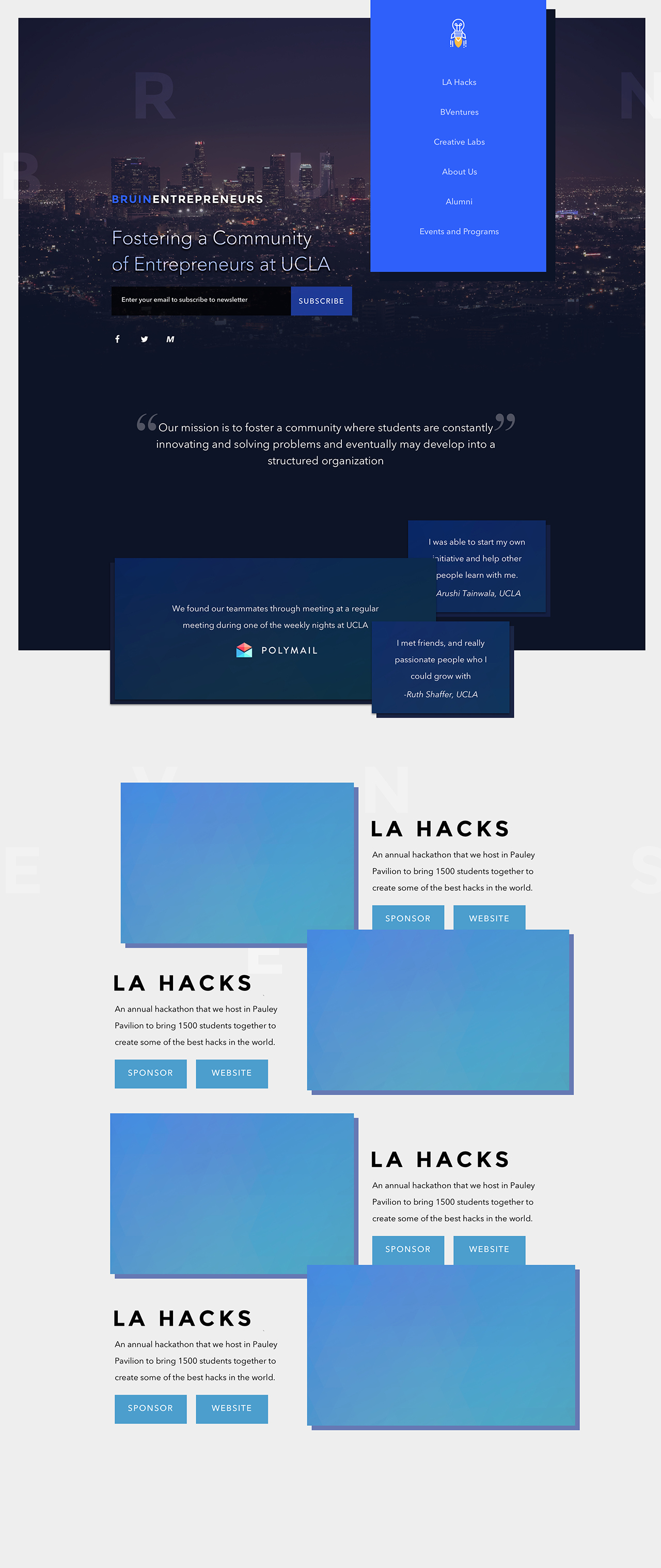 As the design and tech lead for Bruin Entrepreneurs, I made this simple one page website to get students interested in the club and know about it's events. I recently redesigned it to go along with the rebrand for the club that I'm currently working on.