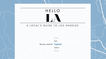 Hello LA is a inside guide to Los Angeles. It is a guide to the best attractions, curated by locals. It is broken into five main categories: eat, explore, learn, party, and shop. It won the Best User Experience award at Hack at Brown"